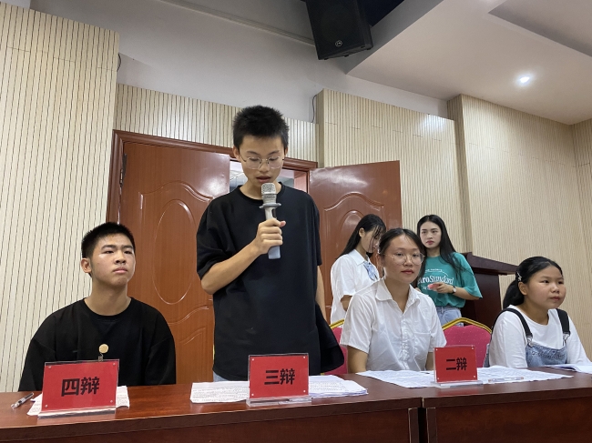 經過初賽的比拼后,2班和3班辯論隊脫穎而出,進入了這場擂主的爭霸。本次比賽的論題是德與才哪個更重要。正方三班的四名選手,他們的論點是德更重要,反方2班的四名選手,他們的論點是才能更重要。