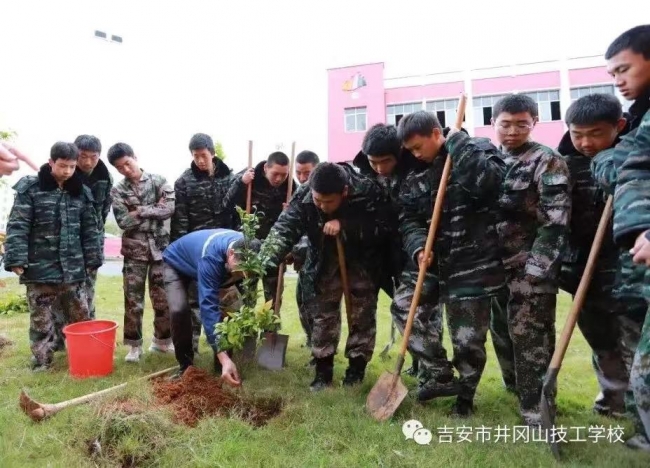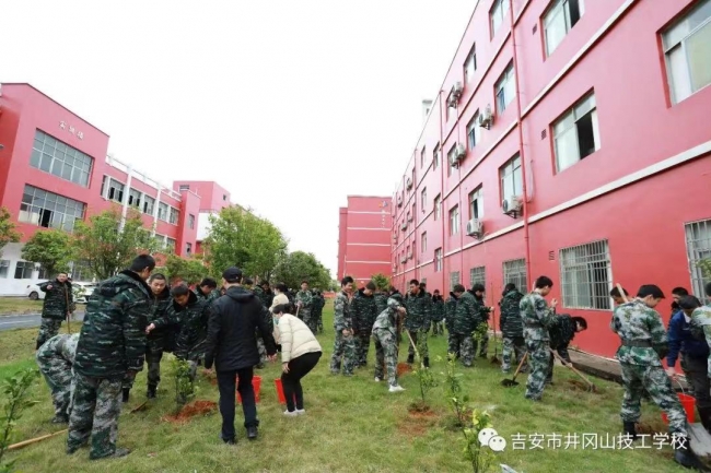 ????植樹現(xiàn)場,師生揮鍬鏟土、培土圍堰,共種沃柑樹、金田柚、樟樹等350棵。植樹現(xiàn)場氣氛熱烈,大家在專業(yè)人士指導下,嚴格按照標準挖坑、種樹、澆水、施肥、培土等,分工明確,相互配合,每項工作井然有序。一株株樹苗整齊排列、迎風挺立,成為一道靚麗的風景線。