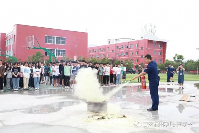 井岡山經(jīng)開區(qū)消防救援大隊(duì)的李指導(dǎo)員為師生現(xiàn)場(chǎng)演示滅火器的使用