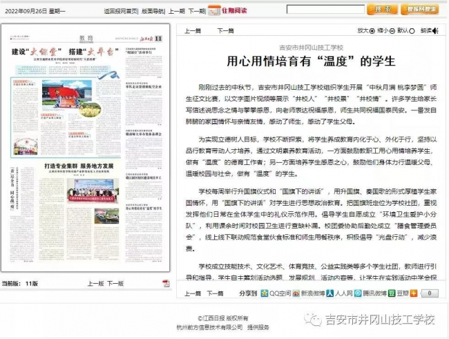 ????剛剛過去的中秋節(jié),因為疫情封校,吉安市井岡山技工學校組織學生開展“中秋月滿 桃李夢圓”師生征文比賽,以文字圖片視頻等展示“井校人”“井校景”“井校情”。許多學生給家長寫信述說思念之情與拳拳感恩,向老師表達祝福感恩,師生共同祝福國泰民安,有老師表達了對學生走好人生路的叮嚀。一番發(fā)自肺腑的家國情懷與親情友情,感動了師生,感動了學生的父母。