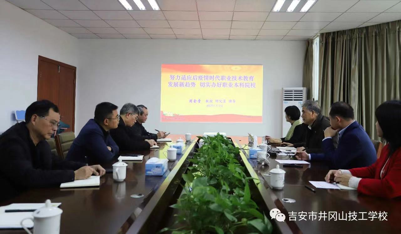 ????周金堂一行參觀了技工學(xué)校、在建的吉安科技學(xué)校后,來(lái)到行政樓會(huì)議室開(kāi)展座談。會(huì)上,校領(lǐng)導(dǎo)介紹了東能集團(tuán)職教項(xiàng)目近年來(lái)的發(fā)展成果和遠(yuǎn)景目標(biāo)規(guī)劃。隨后,周金堂作了《努力適應(yīng)后疫情時(shí)代職業(yè)技術(shù)教育發(fā)展新趨勢(shì),切實(shí)辦好職業(yè)本科院校》的講學(xué)。他表示,東能集團(tuán)職教項(xiàng)目在兩年的時(shí)間內(nèi)發(fā)展迅速,成果豐碩,值得點(diǎn)贊。他指出,在當(dāng)前國(guó)際、國(guó)內(nèi)職業(yè)教育背景和新職業(yè)教育法護(hù)航下,職業(yè)教育發(fā)展將迎來(lái)明媚的春天。作為職業(yè)教育實(shí)際參與者,要牢記習(xí)近平總書記對(duì)職業(yè)教育提出的“堅(jiān)持產(chǎn)教融合、校企合作,堅(jiān)持工學(xué)結(jié)合、知行合一”的指導(dǎo)思想,廣泛調(diào)研,對(duì)東能教育集團(tuán)的辦學(xué)方向、人才培養(yǎng)目標(biāo)進(jìn)行系統(tǒng)規(guī)劃。要立足老區(qū)實(shí)際,堅(jiān)持“五個(gè)振興”的方向,錨定為開(kāi)發(fā)區(qū)服務(wù)目標(biāo),力爭(zhēng)實(shí)現(xiàn)東能教職項(xiàng)目又好又快發(fā)展。